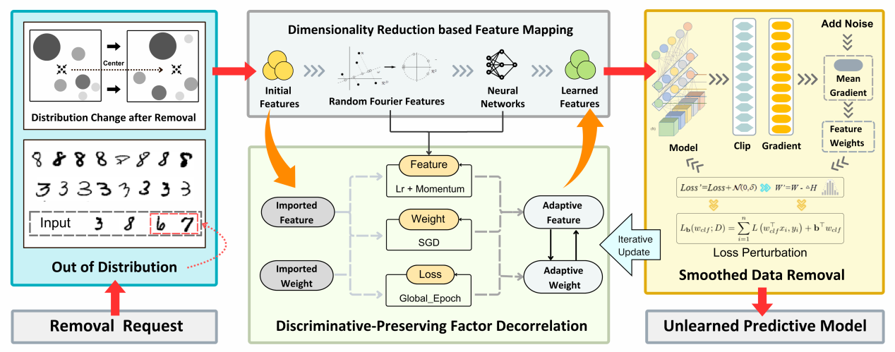 杨文昊等人在李琳教授的指导下,撰写论文“Factor Decorrelation Enhanced Data Removal from Deep Predictive Models”(因子解耦增强的深度预测模型数据遗忘学习框架研究),聚焦当前人工智能领域备受关注的“机器遗忘”(Machine Unlearning)问题。随着用户隐私保护法规(如GDPR)的日益严格,模型需具备高效、可验证地移除特定训练数据的能力,同时保持整体性能稳定。该论文创新性地提出一种基于因子解耦合与损失扰动的双重机制,在实现精准数据遗忘的同时,显著提升了模型在分布内与分布外(OOD)场景下的鲁棒性与泛化能力。研究成果在五个基准数据集上超越现有先进方法,获得审稿人高度评价。